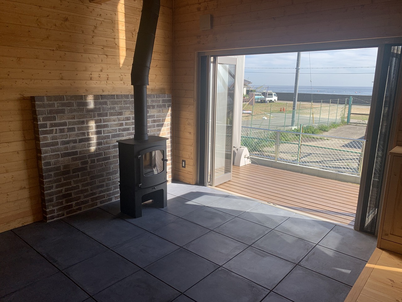 ウッドデッキにはガルバリウムの袖壁付きで、視線をさえぎることでよりプライベートな空間に。